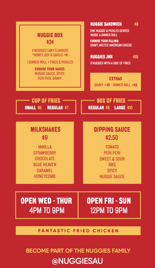 Today, Nuggies has grown into a shop in Ivanhoe and two food trucks that roll out across Melbourne. Whether you’re dropping by our store or spotting us at an event, you’ll always get the same thing: crispy, juicy, fantastic fried chicken done differently — a recipe refined through years of passion, family tradition, and plenty of late nights in the kitchen.